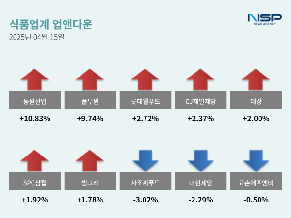 풀무원은 전거래일 대비 9.74%(1380원) 상승해 1만5550원으로 장을 마감했고 롯데웰푸드는 전거래일 대비 2.72%(3100원) 상승해 11만7000원으로 장을 마쳤다.