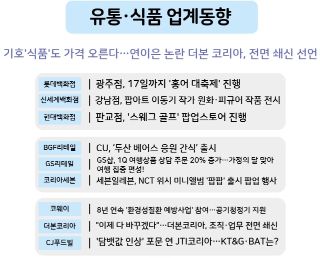(서울=NSP통신) 옥한빈 기자 = 이젠 먹는 식품에 모자라 ‘기호식품’인 담배값도 올라 소비자들의 한숨이 늘고 있다. 다음 달 1일부터 JTI코리아는 메비우스·카멜 등 9종의 담배 제품 가격을 최대 200원 인상한다. 아직까지 KT&G·필립모리스·BAT 등은 인상계획을 밝히지 않고 있다. 한편 더본코리아는 ‘뼈를 깎는’ 조직·혁신을 통한 고객 신뢰 회복에 총력을 다하겠다고 밝혔다. 연이은 논란에 이어 최근 불거진 위생 논란과 직원의 부적절한 언행 등까지 겹친 더본코리아의 향방이 주목되는 대목이다.
