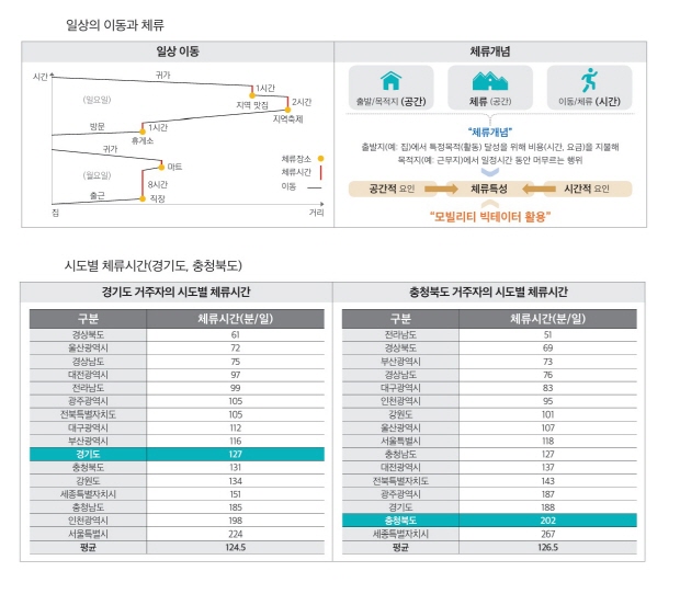 모빌리티 빅데이터로 경기도, 충청북도 거주자의 시도별 일 단위 체류시간 분석결과 경기도 거주자는 서울, 인천, 충남 등에서의 체류시간이 높았고 충북은 세종, 충북, 경기 순으로 높았다.