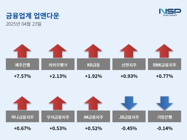(서울=NSP통신) 강수인 기자 = 23일 코스피(+1.57%), 코스닥(+1.39%)은 모두 상승했다. 이 가운데 은행주는 전거래일 대비 1.10% 상승했다. 은행주는 11종목 가운데 9종목이 상승, 2종목이 하락했다.