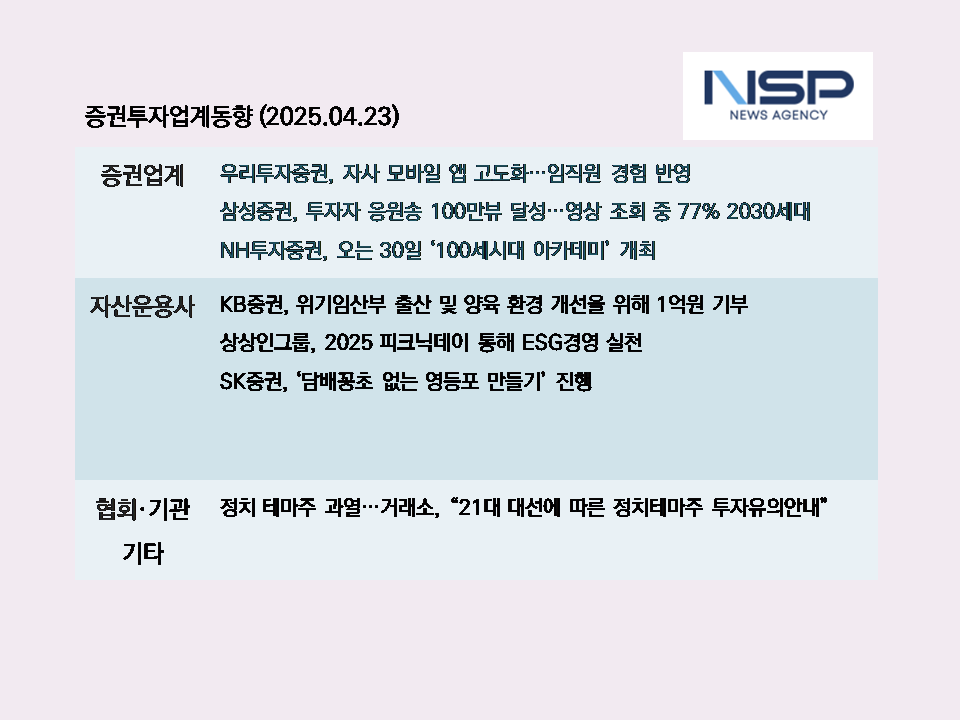 (서울=NSP통신) 설희 기자 = 유력 대선후보가 발과 입에 관련주들의 운명이 달렸다. 관련주들이 요동치자 한국거래소는 21대 대선에 따른 정치테마주 투자유의안내를 당부했다. 증권사는 ESG경영 실천을 통해 기업가치를 제고하고 있다. 우리투자증권은 자사 모바일 앱을 고도화하기 위해 임직원 경험을 반영했다. 운용사 상품군에서는 성장성과 안정성 가진 ETF, TDF가 실적을 기록했다.