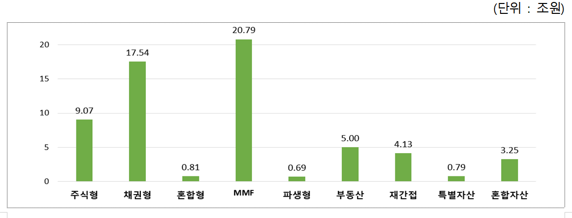 순자산총액 기준으로는 채권형(16.6%), MMF(16.5%), 부동산(16.0%) 순으로 큰 비중을 차지했다.