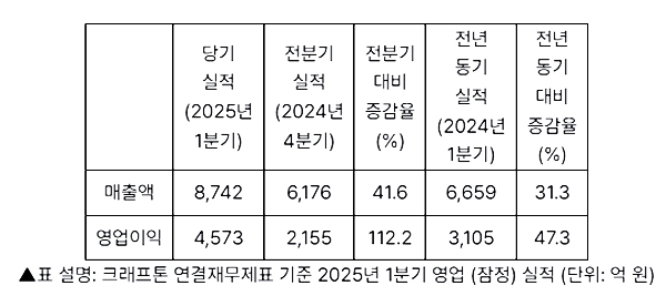 크래프톤은 한국채택국제회계기준(K-IFRS)을 적용한 연결 재무제표를 기준으로 2025년 1분기 ▲매출액 8742억원 ▲영업이익 4573억원을 기록하며 역대 최대의 분기 실적을 달성했다.