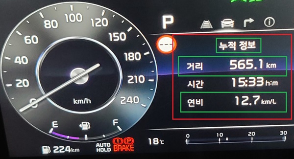 총 565.1km를 15시간 33분 동안 시승한 후 체크 한 기아 셀토스 1.6L 가솔린 터보 모델의 실제 주행 연비는 놀랍게도 12.7km/ℓ를 기록해 매우 만족스러웠다.