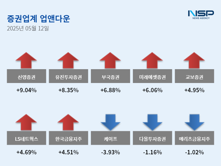 (서울=NSP통신) 설희 기자 = 12일 코스피(+1.17%), 코스닥(+0.40%)은 상승했다. 이 가운데 증권주는 전거래일 대비 2.26% 상승했다. 증권주는 38종목 가운데 상승 34개였고 보합 1개, 하락 3개였다.