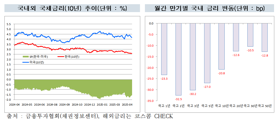 금융투자협회 관계자는 “지난 4월 미국의 국가별 광범위한 범위의 고율 관세 부과 발표와 함께 경기침체 우려, 물가상승 압력, 달러 하락 등으로 인한 금융불안으로 국채 금리는 전월 대비 큰 폭으로 하락 마감했다”며 “지난달 금통위는 경기둔화를 우려하면서도 글로벌 경제전망 및 외환시장 등 각종 불확실성에 대하여 신중함을 보이며 기준금리를 동결하였으나 포워드 가이던스를 통해 향후 3개월 내 기준금리 인하를 예상했다”고 설명했다.