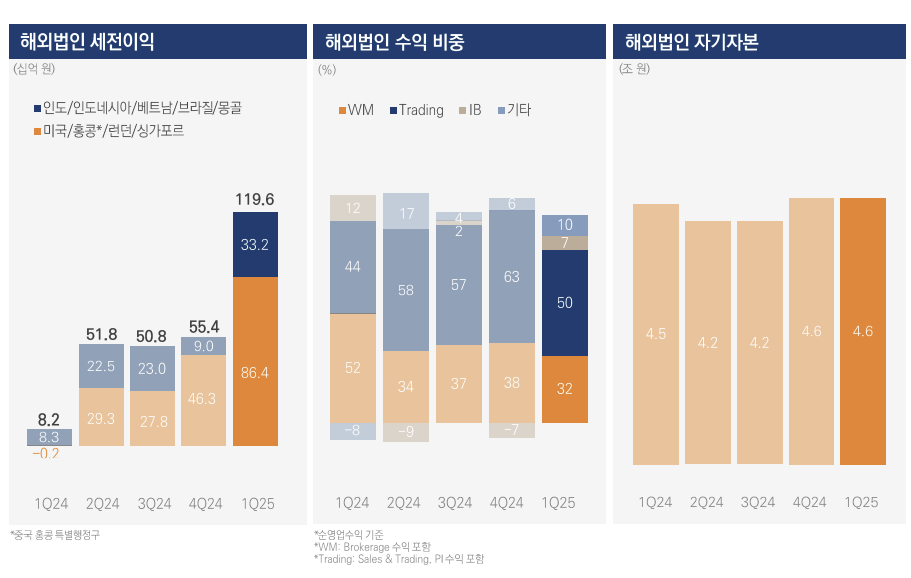 해외점포 수 1위인 미래에셋증권은 25년 1분기 해외법인 세전이익으로 전년 동기 대비 14.5배 증가한 1196억원의 실적을 거뒀다.