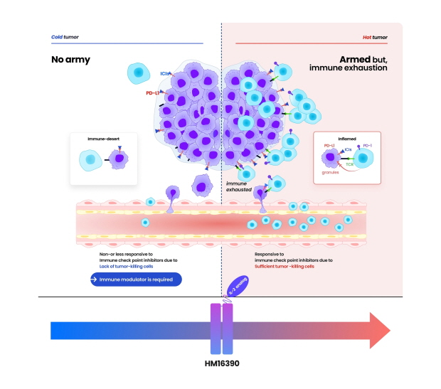 HM16390은 T세포의 증식 및 활성화를 유도하는 기전으로 특히 종양미세환경에서 면역관문억제제에 반응하는 종양침윤림프구(Tumor-Infiltrating Lymphocytes·TIL)의 수를 증가시킨다. 이로써 면역원성이 낮은 cold tumor(면역 세포가 공격 및 침투하지 못하는 종양)를 면역원성이 높은 hot tumor(면역 세포가 종양 내로 침투해 공격이 활성화된 상태의 종양)로 전환해 항종양 효과를 극대화하도록 설계됐다.