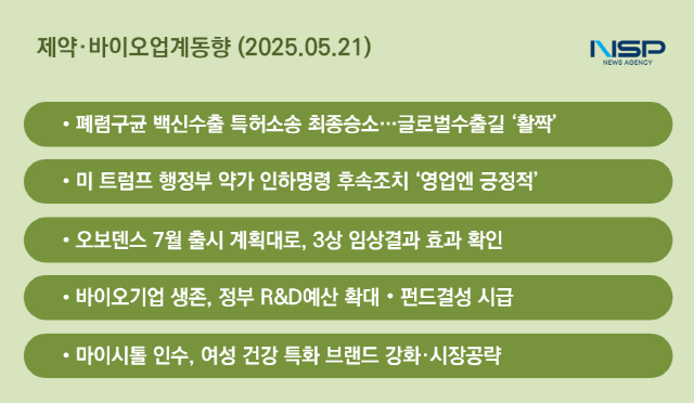 (서울=NSP통신) 문석희 기자 = 21일 제약바이오업계는 SK바이오사이언스가 화이자와의 백신 특허침해금지 소송에서 승소해 수출길을 열었다. 그 동안 미국 도널드 트럼프 행정부의 약가 인하명령에 대한 후속조치 내용 미공개로 어려움을 겪었던 셀트리온은 20일(현지시간) 미국 보건복지부의 공개로 자사제품에는 제한적이라는 소식을 전했다. 이외 휴온스엔이 마이시톨을 인수해 여성건강에 특화 브랜드로 성장시키겠다는 각오를 다졌다.