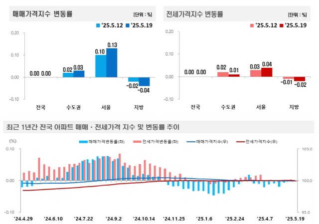 전국 주간 아파트 매매가격은 지난주(0.00%) 대비 보합 유지됐다. 수도권(0.02%→0.03%) 및 서울(0.10%→0.13%)은 상승폭 확대, 지방(-0.02%→-0.04%)은 하락폭 확대됐다. 5대광역시는 -0.06%→-0.06%, 세종은 0.48%→0.30%, 8개도는 -0.02%→-0.03%.