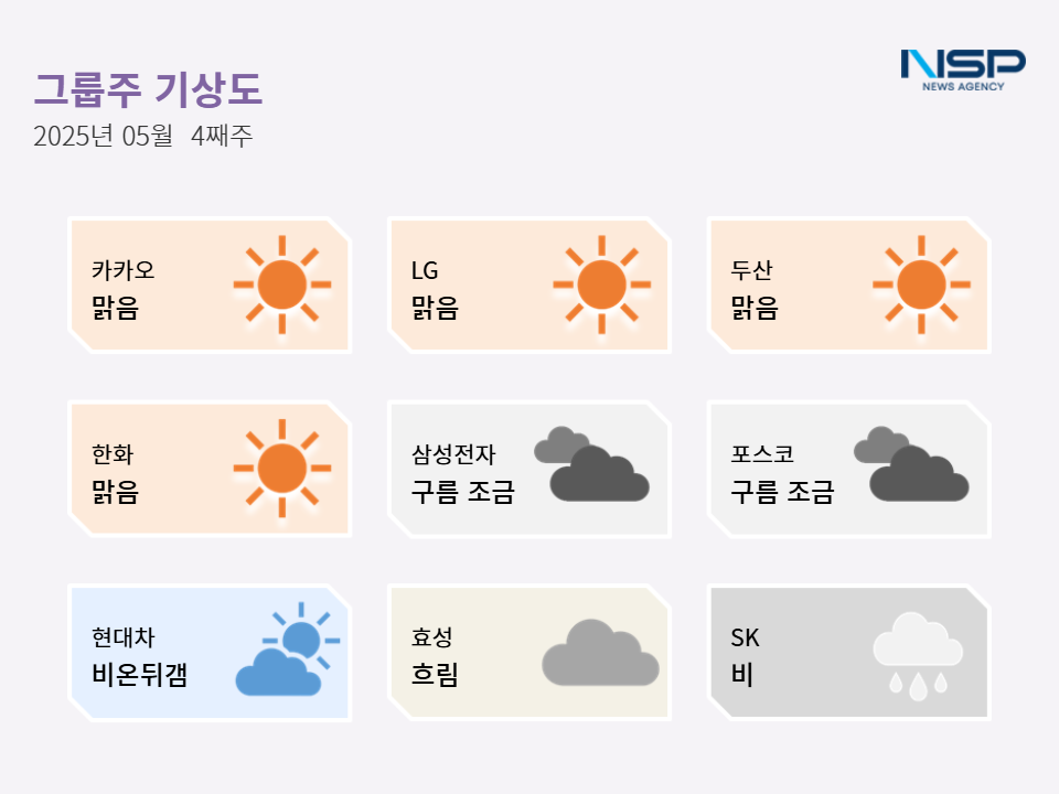(서울=NSP통신) 최아랑 기자 = 2025년 5월 4주차 그룹주 기상도는 카카오·LG·두산·한화의 ‘맑음’, 삼성전자·포스코 ‘구름 조금’, 현대차의 ‘비온뒤 갬’, 효성의 ‘흐림’, SK의 ‘비’로 기록됐다.
