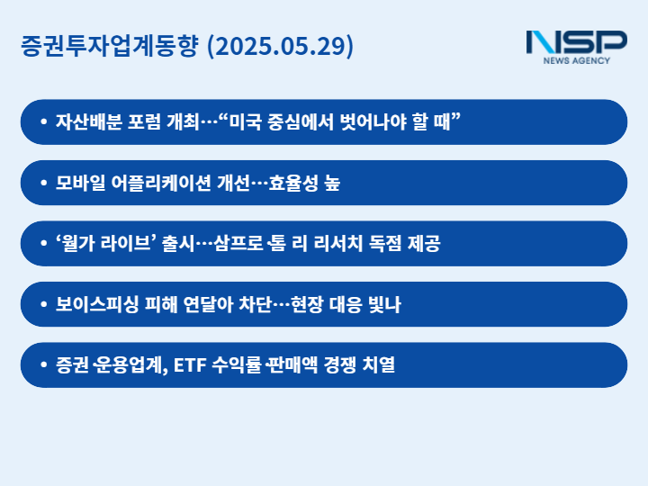 (서울=NSP통신) 설희 기자 = 국내 증권·운용업계가 투자자 중심의 서비스 고도화에 속도를 내고 있다. 모바일트레이딩시스템(MTS) 개선부터 보이스피싱 대응 사례, 고수익 ETF 라인업 확대, 글로벌 자산배분 포럼 개최까지 고객 효율성과 안정성, 글로벌 전략 강화를 위한 행보가 이어지고 있다.