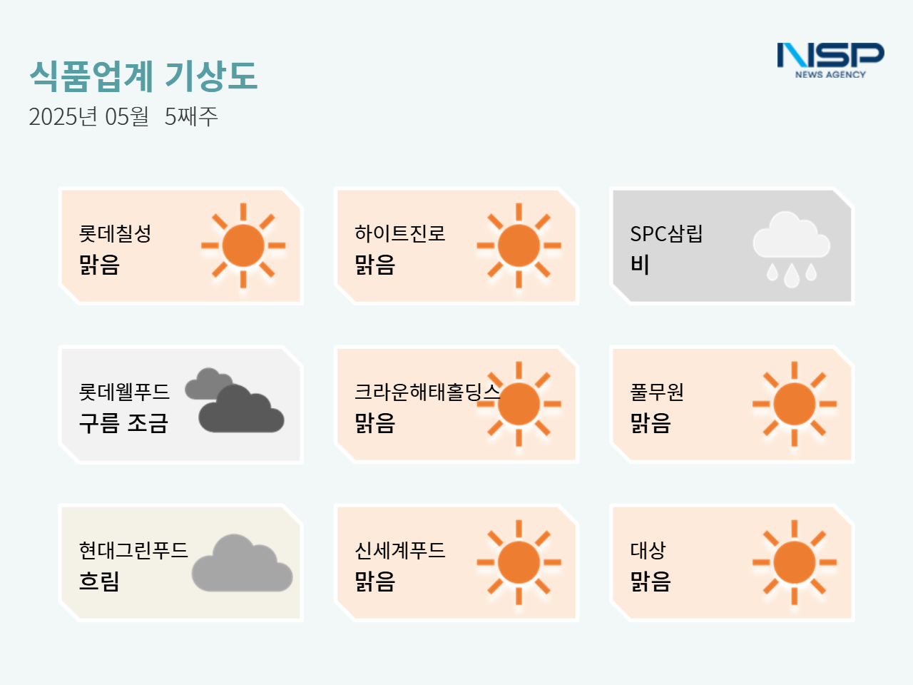 (서울=NSP통신) 옥한빈 기자 = 식품은 종류도 다양하고 취향도 다양해 각종 이슈들이 끊이지 않는 가운데 2025년 5월 5주차 업계 전반적 기상은 맑음으로 선방한 모양세다. 이번 주는 SPC삼립의 근로자 사망 이슈와 그에 따른 크보빵 생산중단의 여파가 심각했다. 다행히 ‘대상’과 ‘하이트진로’의 국위선양으로 마음을 위로할 수 있는 상황이 됐다. 공통적으로는 결국 불안정한 내수시장을 딛고 해외시장까지 눈을 돌린 뒤 투자하는 결론으로 귀결되는 중이다.