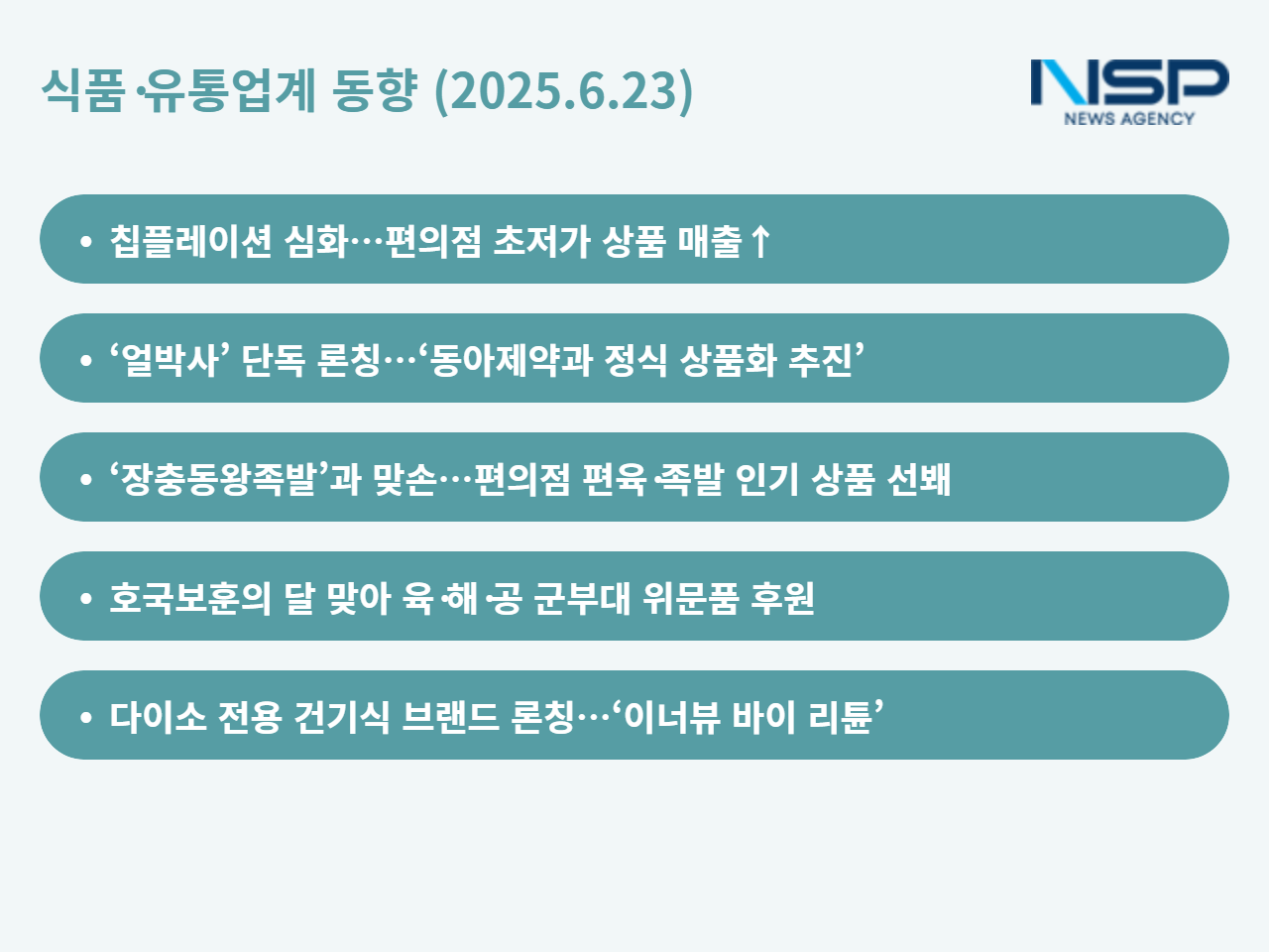 (서울=NSP통신) 옥한빈 기자 = 24일 주목해 볼만한 그림은 편의점계에서 나왔다. 국내 대표 편의점 4사는 각양각색의 모습으로 소비자들의 마음을 사로잡으려는 모양. CU의 ‘초저가’ 부터 GS25의 ‘얼박사’ 까지 모두 살펴봤다. 한편 LG생활건강도 저가시장 공략은 참을 수 없다. 저가 균일가 전문점 다이소에 건기식 브랜드를 론칭하며 실리를 챙기려는 모습이다.