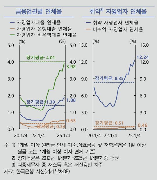 연체율도 치솟고 있다. 취약 자영업자 대출 연체율은 12.24%로 장기평균(8.35%)보다 높은 수준을 지속하고 있다. 2013년 2분기 13.54%을 기록한 이후 최고 수준이다. 취약 자영업자는 대출 상품이 3개 이상인 다중채무자 중에서도 소득 하위 30%거나 신용점수 664점 이하의 저신용자를 가리킨다.