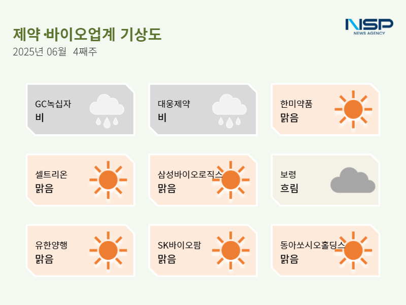 (서울=NSP통신) 문석희 기자 = 2025년 6월 4주차 제약·바이오업계는 대체로 맑았지만 일부 기업에는 비가 내렸다. GC녹십자는 관계사인 GC녹십자의료재단이 유방암 검체를 잘못 바꾸는 사고로 정부 조사를 받고 있으며 대웅제약은 불법 리베이트 의혹으로 도마 위에 올랐다. 보령도 주력 품목인 카나브가 약가 인하 대상에 포함되며 실적 타격이 우려된다. 한편 한미약품의 비만치료제 개발은 착실히 진행되고 있으며 셀트리온과 삼성바이오로직스도 실적 개선 기대감이 높아지고 있다.