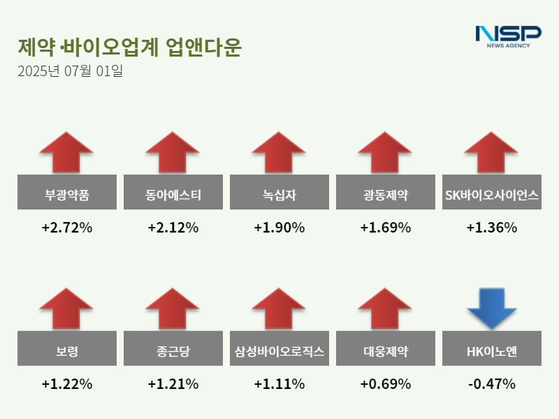 (서울=NSP통신) 문석희 기자 = 1일 코스피(+0.58%)와 코스닥(+0.28%)은 모두 상승했다. 이 가운데 제약주는 전거래일 대비 1.14% 상승했다. 제약주는 185종목 가운데 127종목이 상승, 45종목이 하락했다. 보합세는 13종목이다.