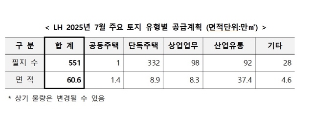 (서울=NSP통신) 강은태 기자 = 한국토지주택공사(LH)는 7월 전국에 60만㎡ 규모 551필지를 공급한다.