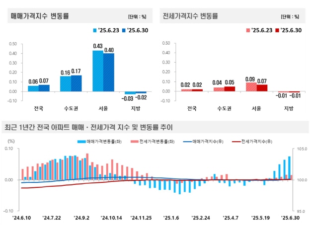 한국부동산원(원장 손태락)이 6월 30일 전국 주간 아파트가격 동향을 조사한 결과 매매가 0.07%, 전세가 0.02%로 상승했다.