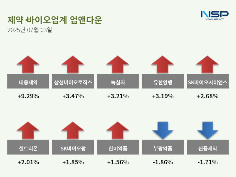 (서울=NSP통신) 문석희 기자 = 3일 코스피(+1.34%)와 코스닥(+1.43%)은 모두 상승했다. 이 가운데 제약주는 전거래일 대비 2.67% 상승했다. 제약주는 185종목 가운데 145종목이 상승, 34종목이 하락했다. 보합세는 6종목이다.