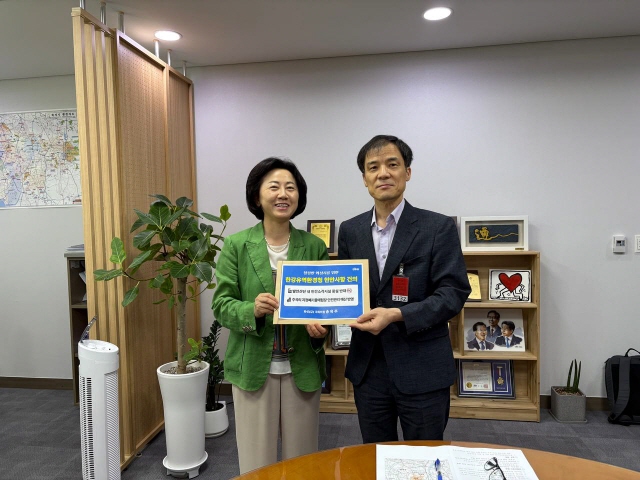 송옥주 국회의원(왼쪽)이 3일 국회 의원회관에서 홍동곤 한강유역환경청장을 만나 주곡리 지정폐기물매립장 사후관리 방안과 발안일반산단 민간소각시설 증설 문제에 대한 주민 건의문을 전달했다. 사진은 현안사항 건의문 전달 기념촬영 모습. (사진 = 의원실)