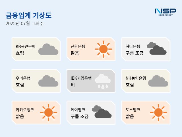 (서울=NSP통신) 강수인 기자 = 2025년 7월 1주차 금융업계기상도는 신한은행·카카오뱅크·토스뱅크의 ‘맑음’, 하나은행·케이뱅크의 ‘구름조금’, KB국민은행·우리은행의 ‘흐림’, IBK기업은행 ‘비’로 기록됐다.