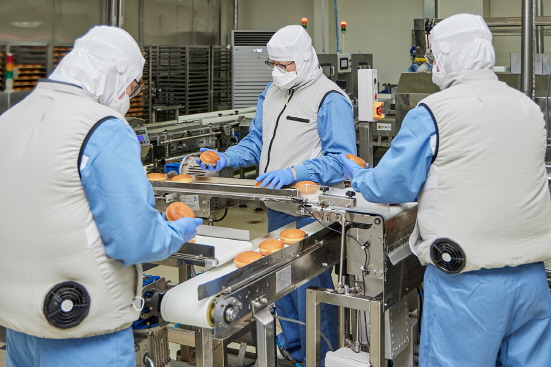 파리크라상, 비알코리아의 생산 현장에는 착용감과 냉방 지속력을 높인 ‘경량형 냉풍조끼’를 지급했다. 조끼에 소형 선풍기가 달려 있는 보냉장구로 얼음팩 등을 사용하는 일반 냉조끼에 비해 가볍고, 축축함이 없어 현장 직원들의 만족도가 높다.