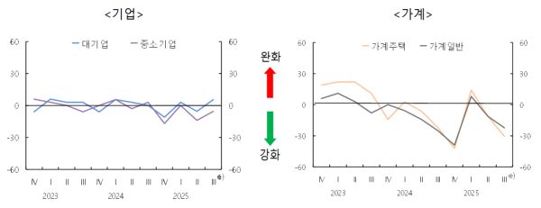기업대출은 중소기업의 경우 -6으로 강화 기조가 이어질 전망인 가운데 대기업에 대해서는 대출 태도가 -6에서 6으로 다소 완화될 것으로 전망된다.
