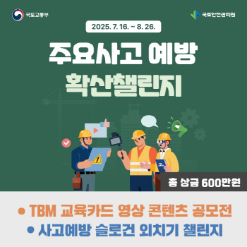 (서울=NSP통신) 강은태 기자 = 국토안전관리원(원장 김일환, 이하 관리원)은 16일 건설현장 안전사고 예방을 위한 ‘2025년 주요사고 예방 확산 챌린지’를 8월 26일까지 개최한다.