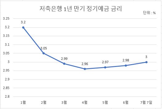 저축은행 정기예금 평균 금리는 지난 1월 3.2%에서 2월 3.05%, 3월 2.99%, 4월 2.96%로 내려간 뒤 5월부터 2.97%, 6월 2.98%, 7월 3%로 올라섰다.