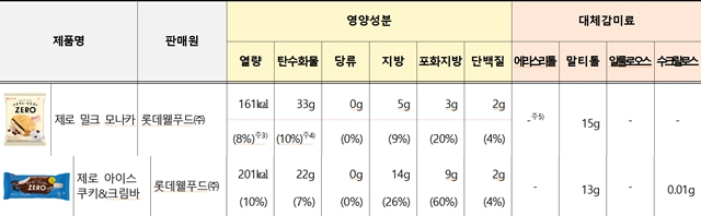 이 외에도 롯데웰푸드의 ‘제로 밀크 모니카’의 경우 대체감미료인 ‘말티톨’이 15g 함유돼 가장 높은 수치를 보였다.