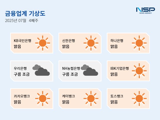 (서울=NSP통신) 강수인 기자 = 2025년 7월 4주차 금융업계기상도는 KB국민은행·신한은행·하나은행·IBK기업은행·카카오뱅크·케이뱅크·토스뱅크의 ‘맑음’, 우리은행·NH농협은행의 ‘구름조금’으로 집계됐다.