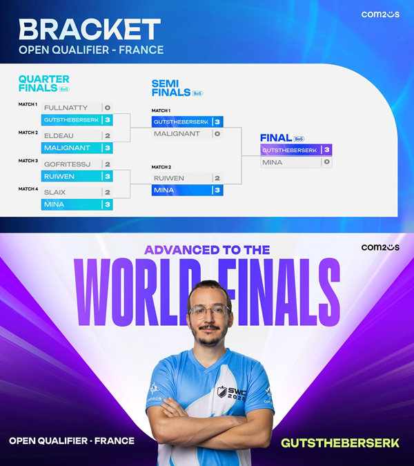 26일 열린 오픈 퀄리파이어-프랑스에서는 SWC2022 유럽 컵 4강까지 진출했던 GUTSTHEBERSERK가 우승을 거머쥐었다. 오픈 퀄리파이어는 월드 파이널이 개최될 지역에 월드 파이널 직행권을 부여하는 경기로, 올해는 FULLNATTY를 비롯한 신인들과 MALIGNANT, ELDEAU 등 프랑스 강자들이 다수 출전해 관심을 모았다. 이 가운데 올해 데뷔한 신인 MINA가 결승까지 치고 올라오는 매서운 저력을 보여줬으나, 결승에서 GUTSTHEBERSERK가 노련한 밴픽으로 3 대 0 압승을 거두며 월드 파이널 직행 티켓의 주인공이 됐다.