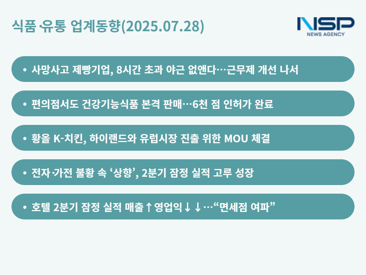 (서울=NSP통신) 옥한빈 기자 = 최근 국정감사를 앞두고서 식품, 유통 업계도 다양한 목소리를 수용하며 조금씩 변화하는 모습을 보이고 있다. 무더위에 고통을 호소하는 물류 노동자들의 목소리에 쿠팡은 합의했고 사망사고로 뒤늦게 불거진 근무 환경 이슈에 SPC도 고개를 숙였다. BBQ는 그 와중 유럽시장을 확대하며 꾸준한 글로벌 진출 야욕을 드러내고 있고 국내에서는 하이마트와 호텔신라의 실적 발표 결과가 흥미롭다.