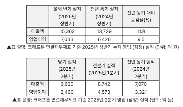 크래프톤은 한국채택국제회계기준(K-IFRS)을 적용한 연결 재무제표를 기준으로 2025년 상반기 ▲매출액 1조5362억원 ▲영업이익 7033억원을 기록하며 반기 사상 최고치를 달성했다. 이는 전년동기 대비 매출액과 영업이익은 각각 11.9%, 9.5% 증가했다.