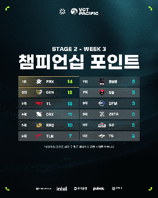 라이엇게임즈(한국 대표 조혁진)는 8월 1일부터 3일까지 서울특별시 마포구 상암동에 위치한 SOOP 콜로세움에서 열린 VCT 퍼시픽 스테이지 2 3주 차에서 한국 팀들이 대거 플레이오프 티켓을 손에 넣었다.