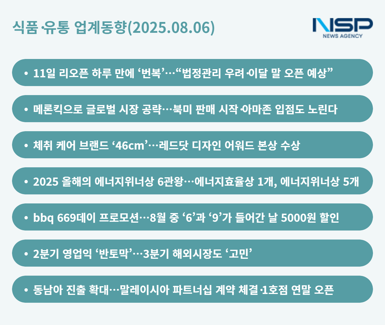 (서울=NSP통신) 옥한빈 기자 = 티몬이 11일로 예정된 리오픈을 잠정 연기했다. 재오픈 소식을 알리며 산뜻한 변신을 예고한지 하루만에 벌어진 일이다. 티몬 측은 오픈 연기에 대해 회생절차가 마무리되지 않아 불확실성을 고려해 결정했다는 입장이다. 이에 반해 농심은 다들 미국 관세에 걱정할 때 생산공장을 앞세워 북미시장 진출에 박차를 가한다. 최근 블랙핑크 제니가 ‘바나나킥’을 좋아한다고 밝히며 인기를 끌었기에 ‘메론킥’도 그 기세를 이어 사랑받을 수 있을지 주목된다. 한편 LG생활건강은 레드닷 디자인 어워드 수상 소식을, 쿠쿠는 올해의 에너지위너상 수상 소식을 전했으며 BBQ는 특유의 별칭인 669를 활용한 8월 이벤트를 펼친다. 이 외에도 롯데웰푸드는 올해 2분기 실적에서 영업이익이 전년 대비 절반가량 줄어들어 그 배경에 관심을 쏟게했다.