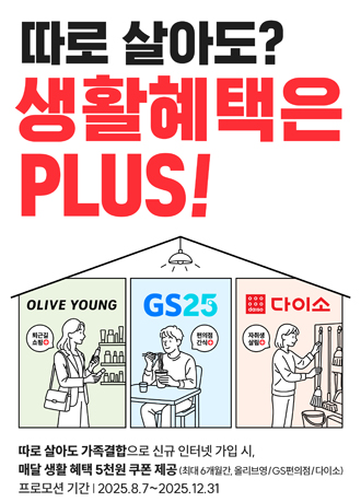 한편 KT는 1인 가구를 위한 전용 혜택 프로그램 ‘따로 살아도 생활혜택 Plus’를 새롭게 선보이고 가족 결합 신청을 보다 간편하게 할 수 있는 ‘셀프 결합’ 서비스를 제공한다.