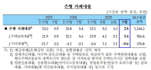 13일 한국은행이 발표한 ‘2025년 7월중 금융시장 동향’에 따르면 7월 은행 가계대출 증가폭은 2조 8000억원으로 나타났다. 7월말 가계대출 잔액은 1164조 2000억원으로 집계됐다.