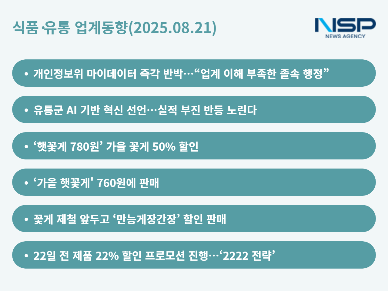 (서울=NSP통신) 옥한빈 기자 = 유통업계가 ‘마이데이터 제도’를 두고 긴강감을 고조시킨다. 개인정보위의 마이데이터 시행령 개정안을 두고 온라인쇼핑협회가 “졸속 행정”이라며 즉각 반발했고 기업 가치 훼손 우려까지 불거지며 업계는 민감하게 반응 중이다. 한편 롯데 유통군은 AI를 전면에 내세운 혁신 전략을 공개하며 부진한 실적을 반등시키기 위한 승부수를 띄웠다. 지난 20일에 꽃게 금어기가 해제되자 마자 시즌을 맞은 대형마트의 가격 전쟁도 본격화됐다. 이마트와 홈플러스가 100g당 700원대 파격가로 맞불을 놓으며 ‘가을 꽃게 최저가 경쟁’에 불을 지폈고, 샘표는 만능게장간장으로 꽃게 시즌을 활용한 제품 전략을 펼쳤다. 여기에 뚜레쥬르는 22일에 맞춰 전 제품 22% 할인 프로모션으로 소비자 지갑 공략에 나선다. 일명 2222 전략이다.