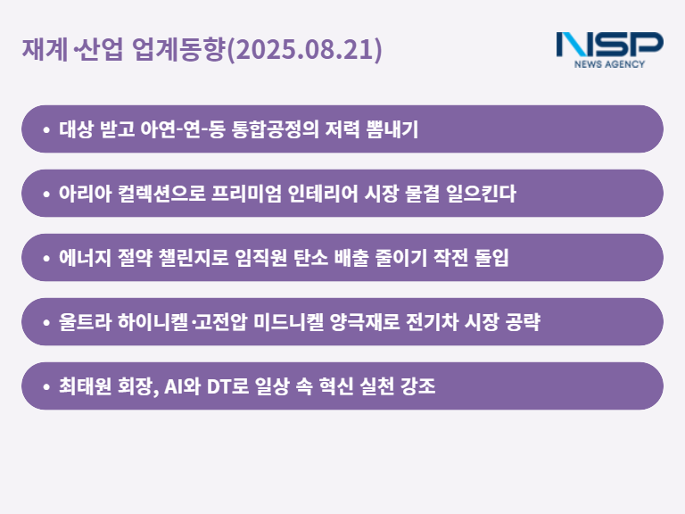 (서울=NSP통신) 최아랑 기자 = 국내 주요 기업이 친환경·프리미엄 시장, ESG 실천, 첨단 소재와 AI 혁신 등 다방면에서 경쟁력 강화에 속도를 내고 있다. 신사업 투자와 기술 개발, ESG 캠페인, 글로벌 시장 공략 등 기업들은 미래 성장과 지속가능성을 동시에 챙기며 쟁력 선점을 위한 행보를 이어가고 있다.