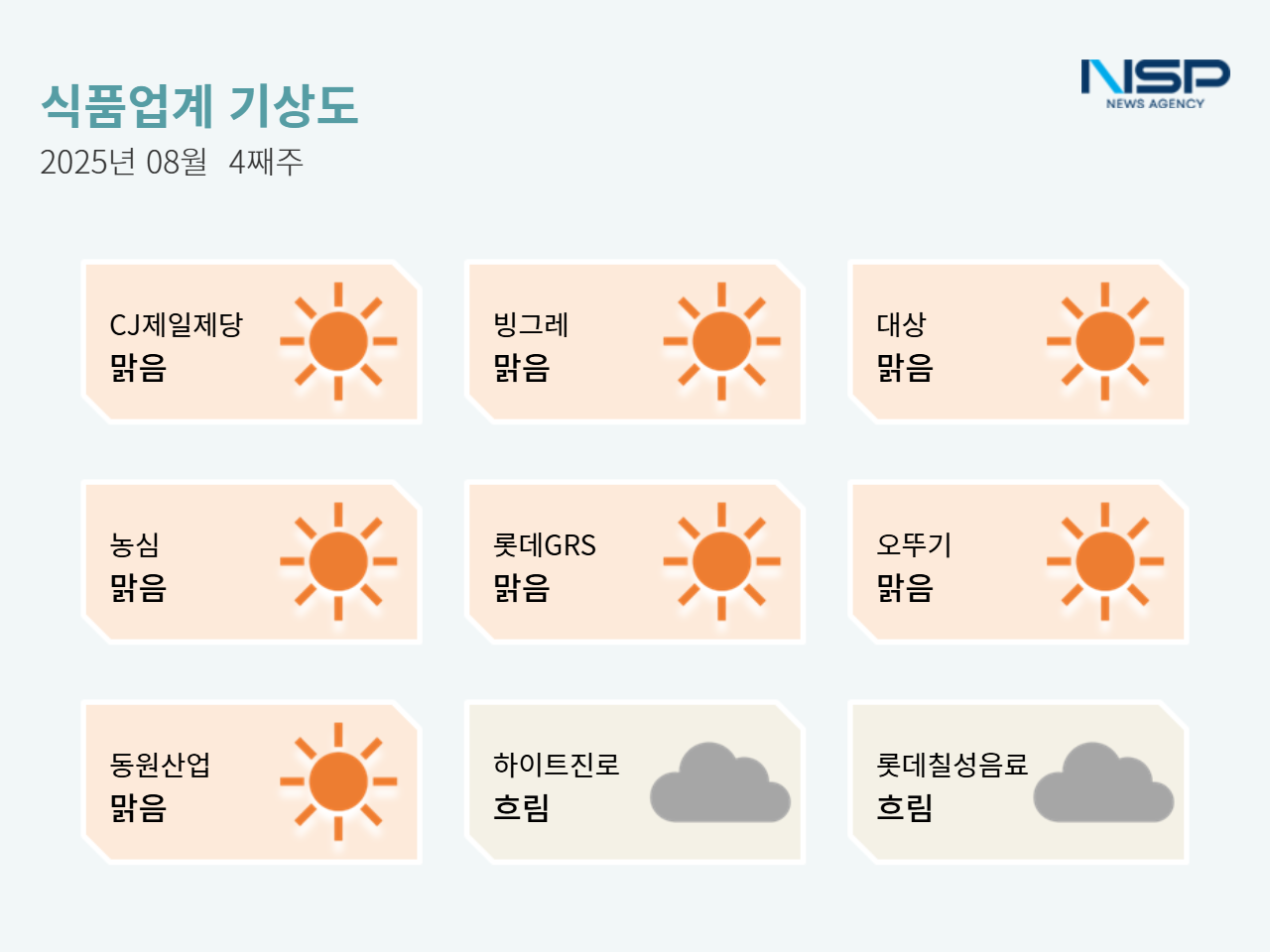 (서울=NSP통신) 옥한빈 기자 = 이번 주 식품업계 하늘은 대체로 ‘맑음’이었다. CJ제일제당을 비롯해 빙그레, 대상, 농심, 오뚜기, 동원산업, 롯데GRS 등 굵직한 기업들이 신제품 출시, 글로벌 협업, 브랜드 확장, 해외 진출 성과 등 호재성 이슈를 쏟아내며 활기를 보였다. 특히 K-푸드에 대한 글로벌 관심이 높아지는 가운데 김치·라면·간편식 등 각사 대표 제품군이 해외시장에서 존재감을 키우고 있다는 점이 눈길을 끈다. 이제는 더 이상 국내의 이슈로만 흘러가지 않는 식품업계의 모습이다. 한편 모든 하늘이 파랗지만은 않았다. 하이트진로와 롯데칠성은 2분기 실적 부진이라는 먹구름을 피하지 못했다. 그럼에도 협업 제품, 축제 후원, 해외 시장 개척과 같은 돌파구 마련에 나서며 위기 속에서 반전을 꾀하는 모습이다.