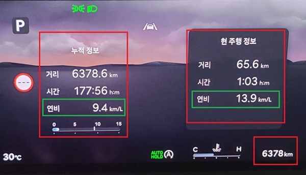 NSP통신-65.6km 주행 연비 13.9km/ℓ(우)와 총 6378.6km를 177시간 56분 동안 시승한 후 체크 한 제네시스 G80 블랙 모델의 실제 연비 9.4km/ℓ 기록(좌)