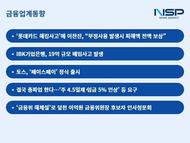 (서울=NSP통신) 강수인 기자 = 금융당국이 금융소비자 보호를 강조한 이후 롯데카드에서 해킹사고가 발생해 금융권이 긴장하고 있다. 이찬진 금융감독원은 금융권 CEO(최고경영자) 책임 아래 금융보안 관리체계를 재점검하라고 지시했다. 한편 금융노조의 투표 결과 94.98%의 찬성표가 나오면서 오는 26일부터 총파업에 나설 예정이다.
