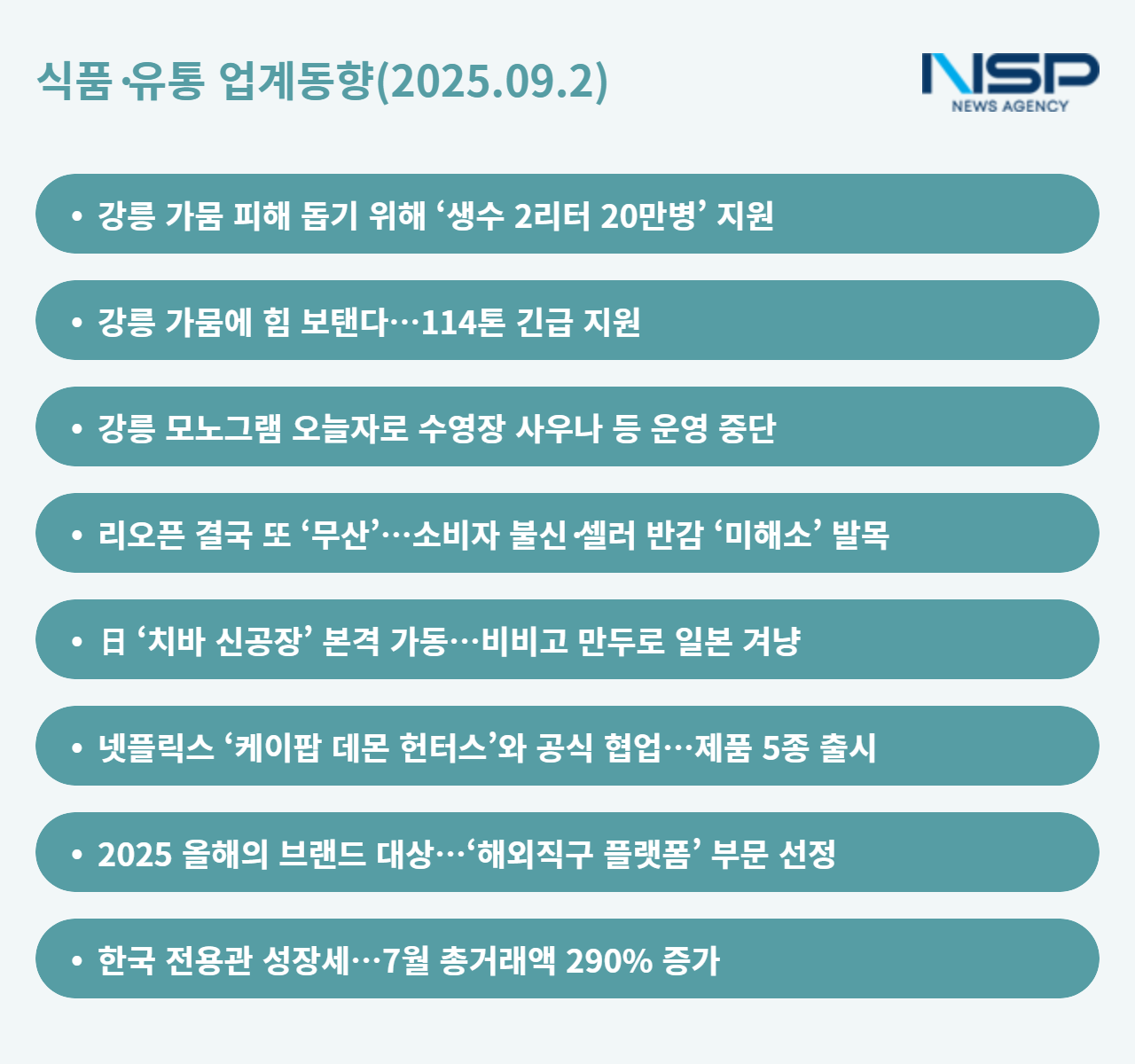 (서울=NSP통신) 옥한빈 기자 = 가뭄에 국가 재난 사태다. 강릉의 하늘은 비를 주지 않았지만 유통업계는 ‘물’을 보냈다. 쿠팡은 생수 20만 병을, 제주삼다수는 114톤을 들고 달려왔고, 신라모노그램은 과감히 수영장을 닫아 물 절약에 동참했다. 반대로 티몬은 또다시 리오픈에 실패하며 갈라진 소비자 신뢰라는 ‘가뭄’을 메우지 못하고 있다. 한편 글로벌로 눈을 돌리면 CJ제일제당이 일본에서 만두 공장을 가동하며 K-푸드의 깃발을 꽂았고 파리바게뜨는 넷플릭스와 손잡아 K-컬처에 올라탔다. 해외직구 전쟁터에서는 테무와 알리익스프레스가 폭풍 성장을 이어가며 C커머스의 새로운 물줄기를 열고 있다. 누군가는 물을 나르고, 누군가는 물결을 타는, 오늘의 식품·유통업계 풍경이다.