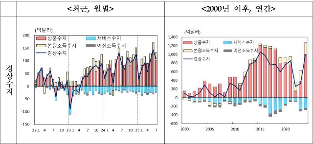 4일 한국은행이 발표한 ‘2025년 7월 국제수지(잠정)’에 따르면 지난 7월 경상수지는 107억 8000만달러 흑자를 기록했다. 7월 기준 역대 최대 흑자이며 27개월 연속 흑자다.