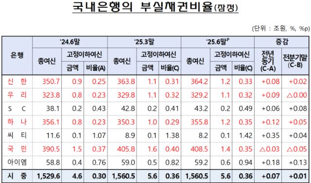 5일 금융감독원이 발표한 ‘2025년 6월말 국내은행의 부실채권 현황(잠정)’에 따르면 6월말 국내은행의 부실채권비율은 0.59%(6조 6000억원)로 집계됐다.