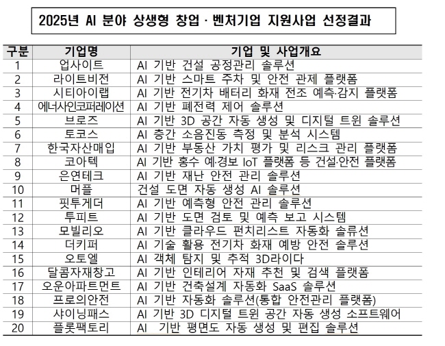 올해 성장지원 사업 공모에는 총 86개 기업이 신청해 4대 1 이상의 경쟁률을 기록했다. 그중 혁신적 아이디어와 기술력을 보유한 건설 관련 AI분야 특화 스타트업 20개 사가 선정됐다.