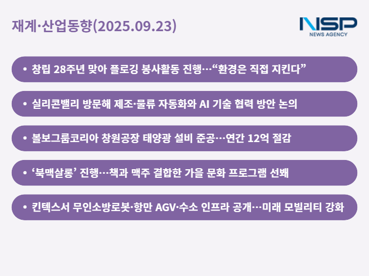 (서울=NSP통신) 최아랑 기자 = 국내 주요 기업들이 ESG, AI, 에너지 전환, 문화 콘텐츠, 미래 모빌리티 등 각 분야에서 발걸음을 재촉하고 있다. 환경 정화 활동에 나선 SK, 창원공장 지붕 위 태양광 설비를 올린 LS일렉트릭, 글로벌 AI 협력에 나선 두산, 새로운 문화 실험을 진행한 영풍문고, 미래차 전략을 전시한 현대로템까지 기후·기술·시장 대응이 공통분모로 나타난다.