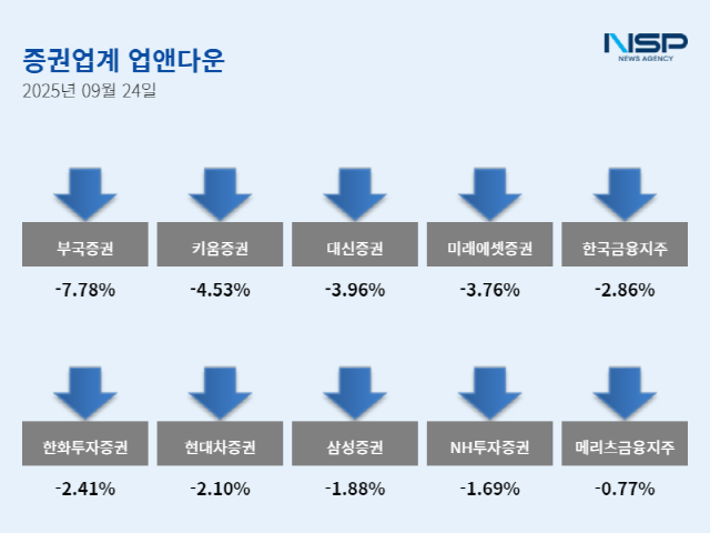 (서울=NSP통신) 임성수 기자 = 24일 코스피(-0.40%) 하락, 코스닥(-1.29%)도 하락했다. 증권주는 전 거래일 대비 2.46% 하락했다. 증권주 38종목 가운데 상승은 1개, 보합 1개, 하락 36개다.